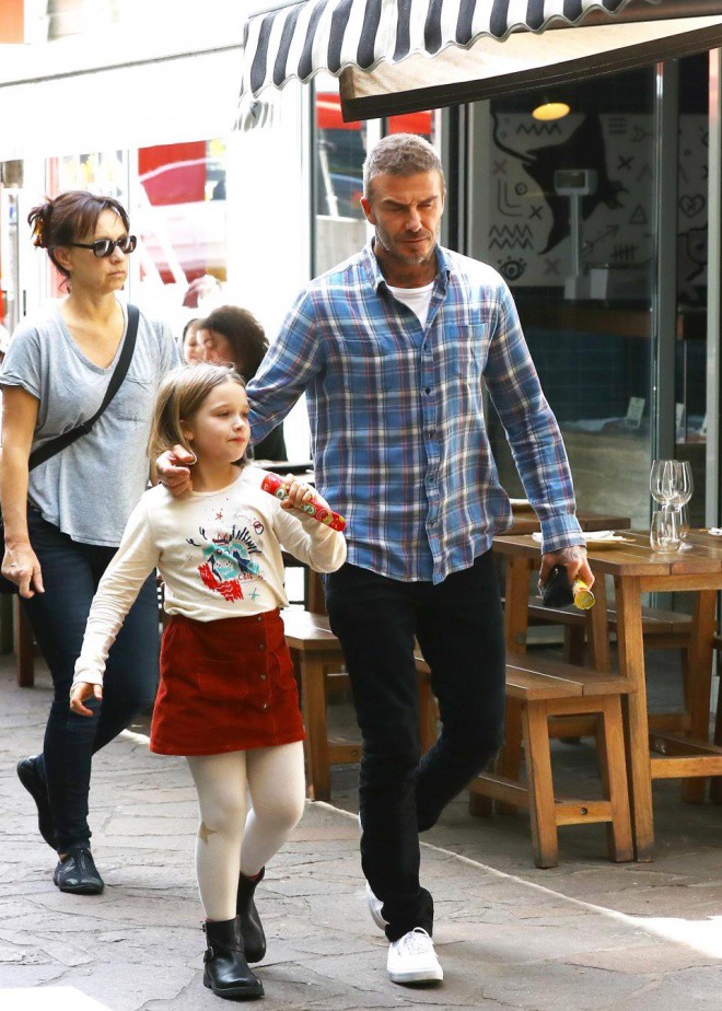 David Beckham trông khá căng thẳng khi đưa cô bé Harper đi chơi ở Úc.