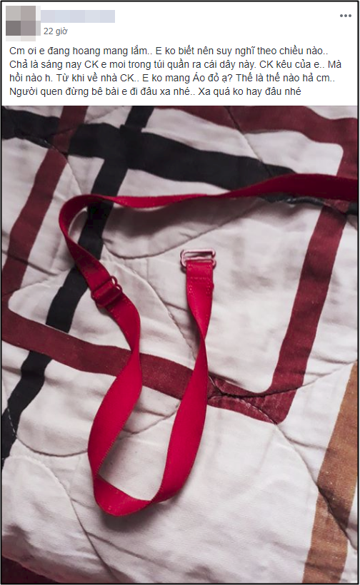 "Các mẹ ơi em đang hoang mang lắm. Em không biết nên suy nghĩ theo chiều nào. Chả là sáng nay chồng em moi trong túi quần ra cái dây này. Chồng kêu của em, mà hồi nào giờ từ khi về nhà chồng em không mang áo đỏ ạ. Thế là thế nào hả các mẹ?"