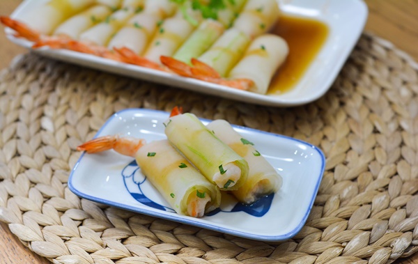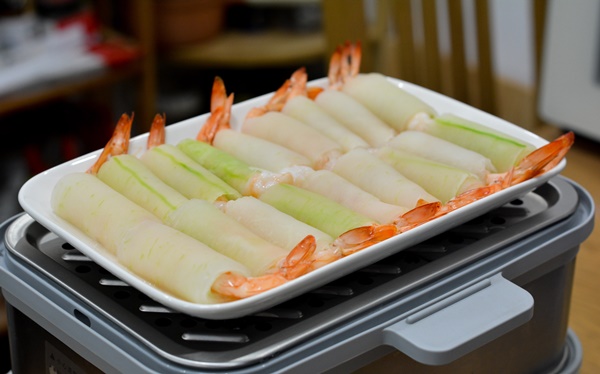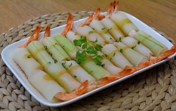 6. Cắt xẻ vài lát vào lưng và bụng tôm để tôm hấp chín sẽ không bị cong, lấy một lát bí trải dài rồi cuộn tôm.