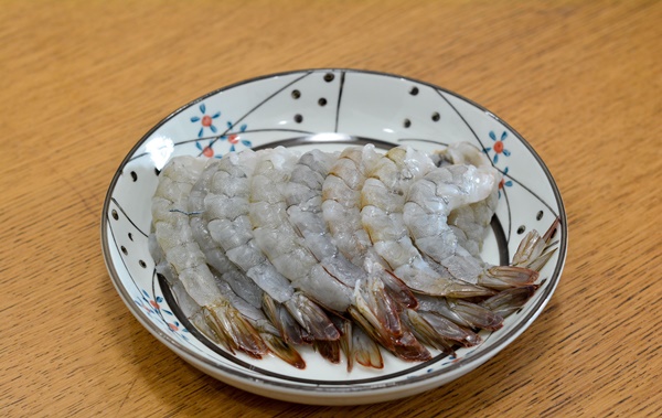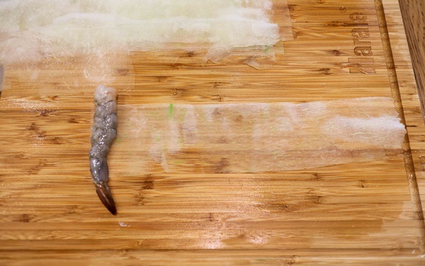 2. Bỏ vỏ, giữ lại đuôi tôm, cắt bỏ đường chỉ tôm, rửa sạch.