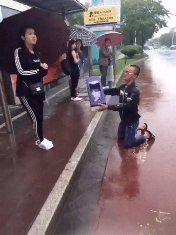 Tuy nhiên, người phụ nữ của anh ta lại chẳng thèm đoái hoài gì đến tấm chân tình của anh chàng. Cô này thản nhiên cầm ô đứng dưới mưa, coi như không biết đến sự tồn tại của chàng trai kể trên, thậm chí còn tìm cách đứng tránh sang một góc khác của nhà chờ xe buýt.