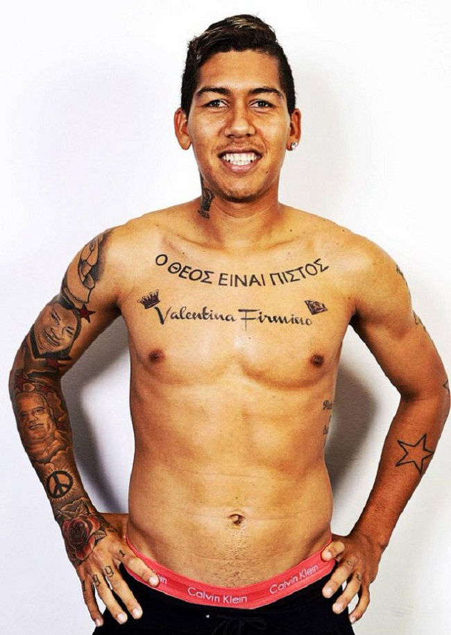 5. Firmino của tuyển Brazil cũng sở hữu thân hình lực lưỡng, đầy nam tính. Anh xăm rất nhiều hình trên cơ thể để thể hiện tình yêu với bố mẹ, vợ và con gái.