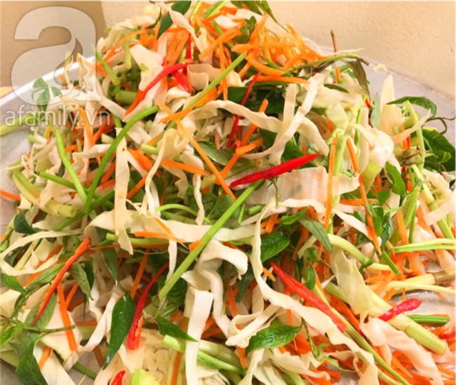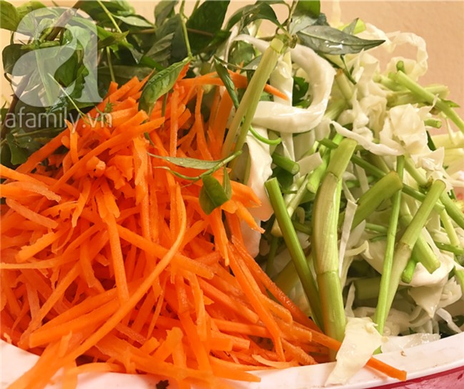 Rau cần nhặt sạch bỏ lá, bắp cải thái sợi, cà rốt thái sợi, rau răm bỏ gốc. Đem tất cả rửa sạch để ráo nước.