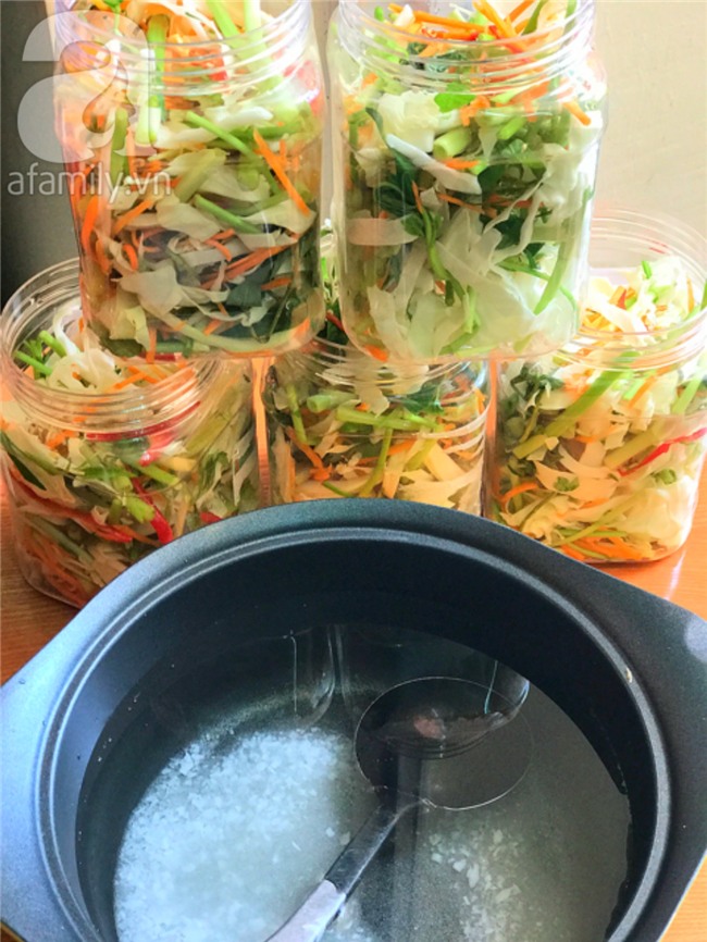 Đun sôi 3 lít nước để nguội rồi pha với 1 thìa canh muối hạt, 2,5 thìa canh đường và 200ml giấm trắng.