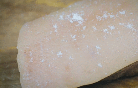 - Dùng giấy ăn lau kỹ phần da lại lần nữa. Rắc 1 ít muối lên, bọc kín ướp 8 tiếng hoặc qua đêm trong tủ lạnh.
