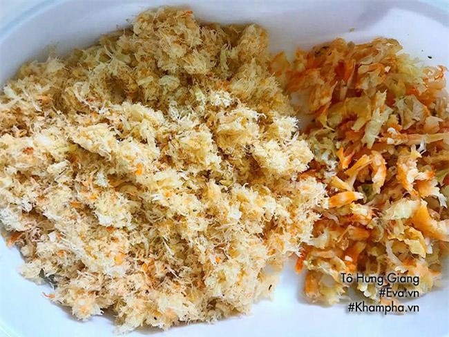 Bước 2: Chia tôm khô thành hai phần đều nhau, một phần đem xay bông thành ruốc, một phần dùng tay xé nhỏ ra.