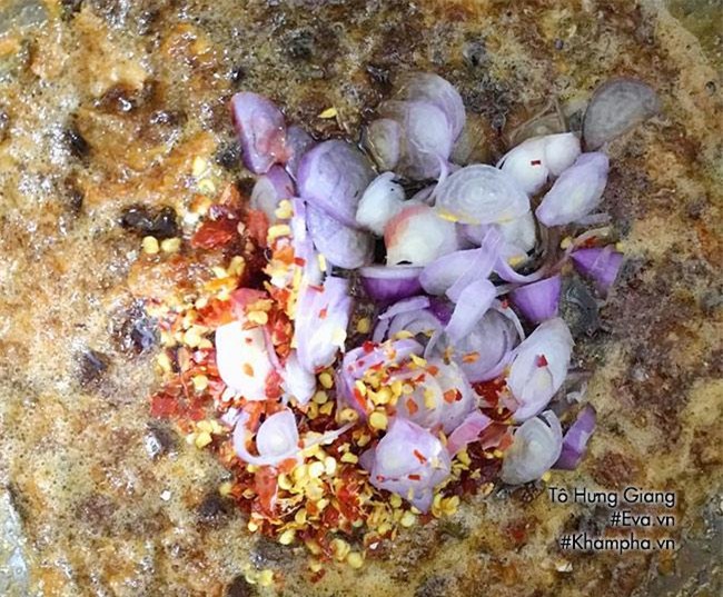 Bước 6: Đợi mắm sôi lại hạ nhỏ lửa hơn nữa, cho hành khô và ớt xay nhỏ hoặc băm nhuyễn vào. Đun thêm 2-3 phút nữa là tắt bếp.