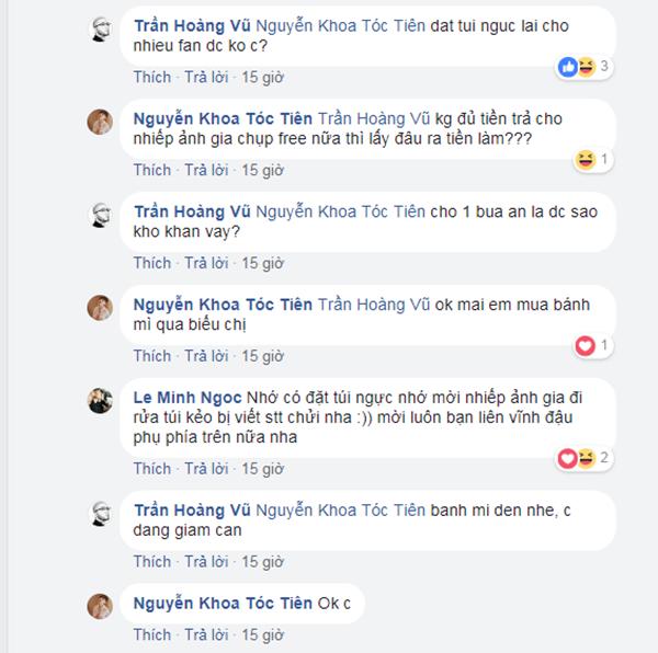 Cuộc khẩu chiến chưa dừng lại ở đó khi mà nhiếp ảnh gia Milor Trần (Trần Hoàng Vũ) – người đã thực hiện shot ảnh này đã nhảy vào bình luận một cách đầy mỉa mai “Đặt túi ngực lại cho nhiều fan được không chị?”. Ngay lập tức, Tóc Tiên vội vã tiếp lời “Không đủ tiền trả cho nhiếp ảnh gia chụp free nữa thì lấy đâu ra tiền làm?”.