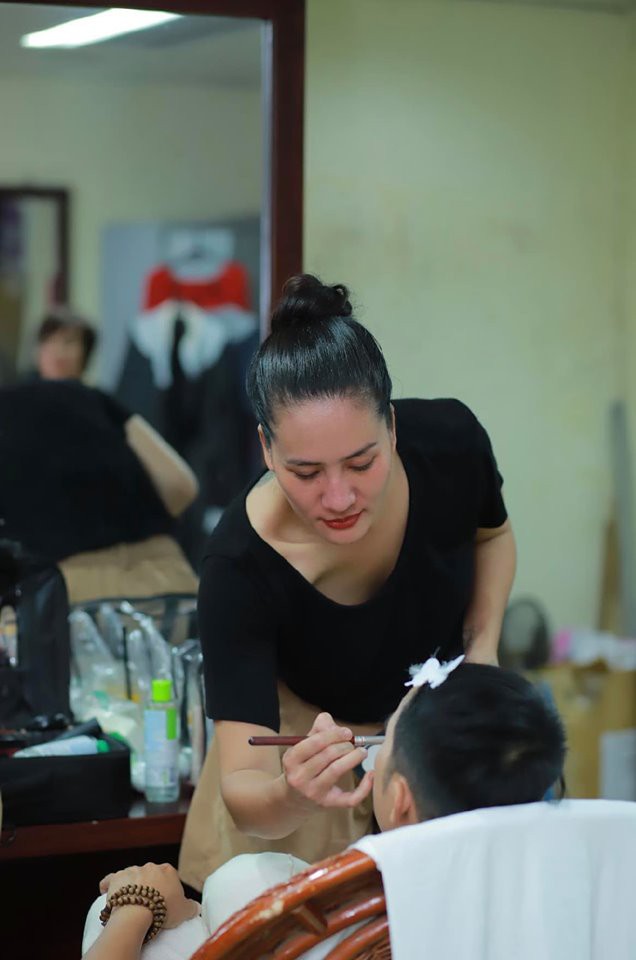 Diễn viên Minh Cúc say mê với công việc makeup.