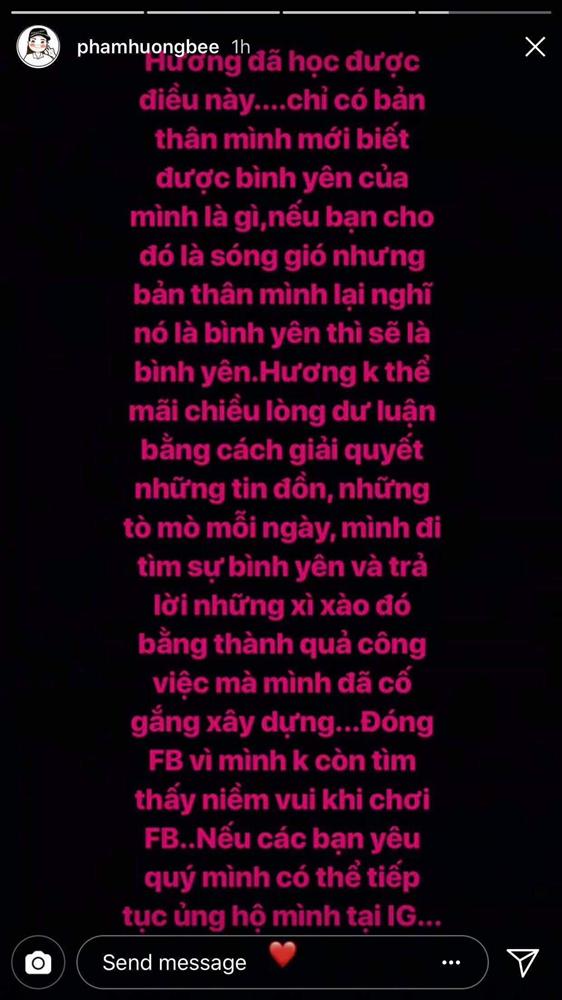 Mới đây trên Instagram, Phạm Hương đã tiết lộ lý do dẫn dến việc không sử dụng Facebook. Theo đó, cô cho biết: "Hương đã học được điều này. Chỉ có bản thân mình mới biết được bình yên của mình là gì. Nếu bạn cho đó là sóng gió nhưng bản thân mình lại nghĩ nó là bình yên thì sẽ là bình yên. Hương không thể mãi chiều lòng dư luận bằng cách giải quyết những tin đồn, những tò mò mỗi ngày. Mình đi tìm sự bình yên và trả lời những xì xào đó bằng thành quả công việc mà mình đã cố gắng xây dựng... Đóng Facebook vì mình không còn tìm thấy niềm vui khi chơi Facebook. Nếu các bạn yêu quý mình có thể tiếp tục ủng hộ mình tại Instagram".