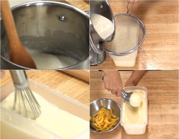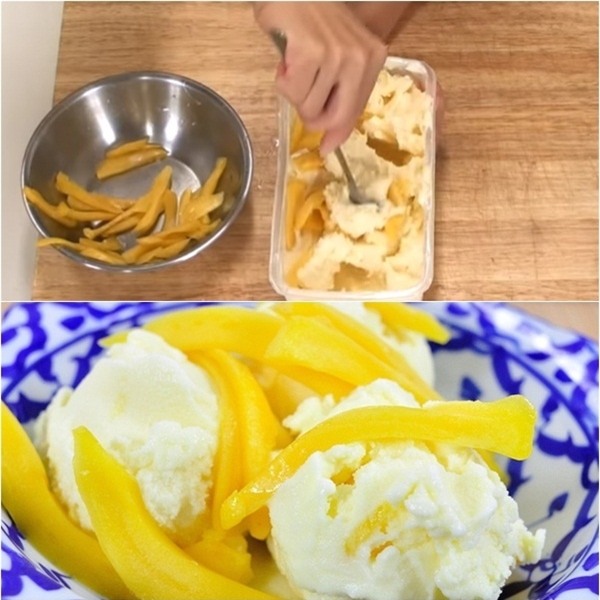 - Khuấy thật đều. Bỏ vào tủ lạnh. Cứ 2-3 tiếng thi thoảng lấy ra trộn đều lên 1 lần. Làm như vậy 3-4 lần là kem mịn, dẻo ngon.