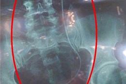 Tại bệnh viện, bác sĩ xác định đây là trường hợp dị vật gây tổn thương niệu đạo. Kết quả chụp X-quang và siêu âm cho thấy dị vật nằm trọn trong bàng quang.