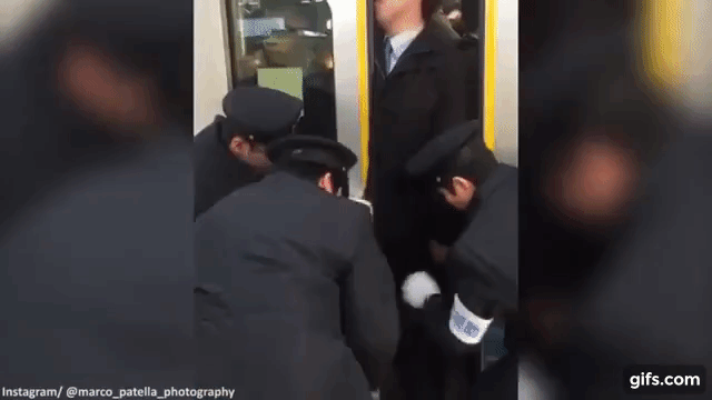 Từ đoạn video có thể thấy hình ảnh một nhân viên văn phòng tay cầm điện thoại, mặt bình thản đứng cạnh cửa tàu và chờ đợi để "được" chèn lên tàu dù rằng phía bên trong chẳng còn thấy chỗ trống. Sau đó, các nhân viên ga tàu, thường là các sinh viên làm thêm, sẽ "dồn hết sức bình sinh" để đẩy các hành khách cuối cùng vào sau cánh cửa.