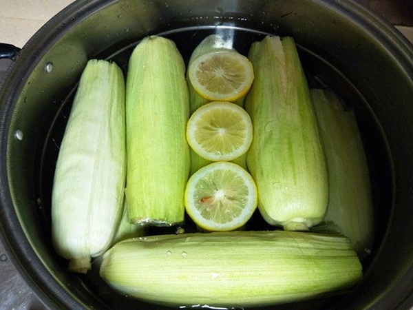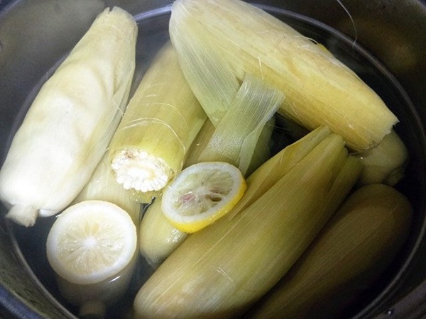Xếp ngô vào nồi, thêm nước cho xâm xấp mặt bắp ngô, thêm muối, baking soda và chanh thái lát vào. Việc thêm lát chanh còn có thể làm tăng mùi thơm của ngô.
