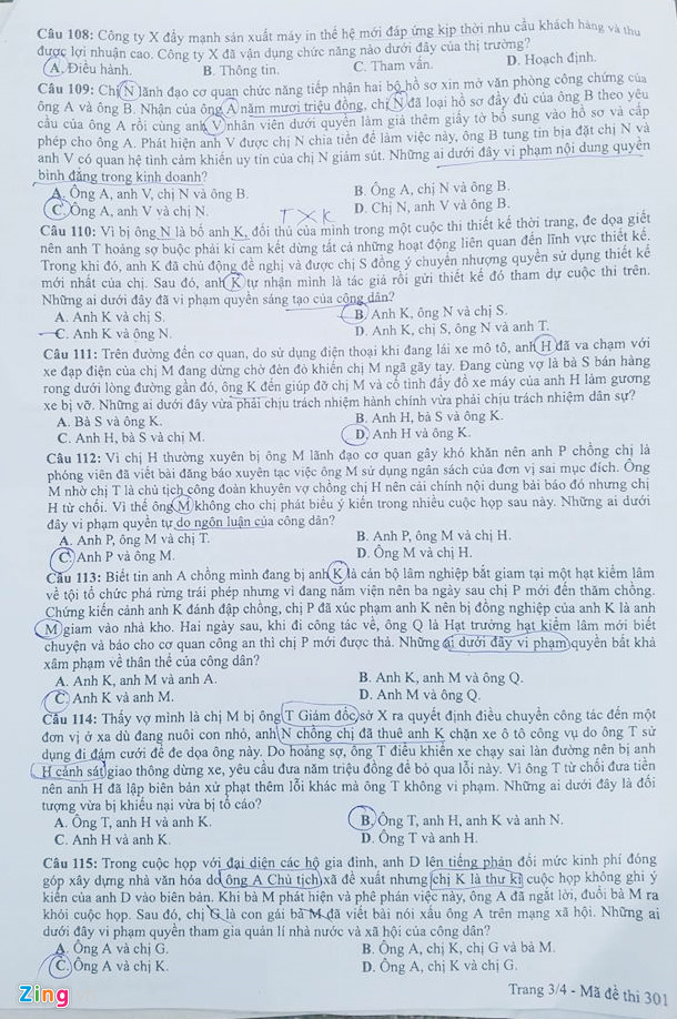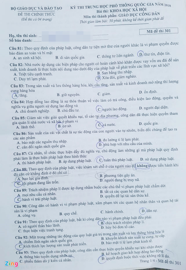 Đề thi môn Giáo dục Công dân mã 301
