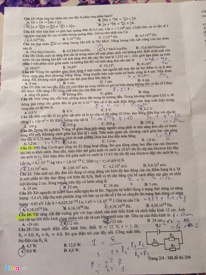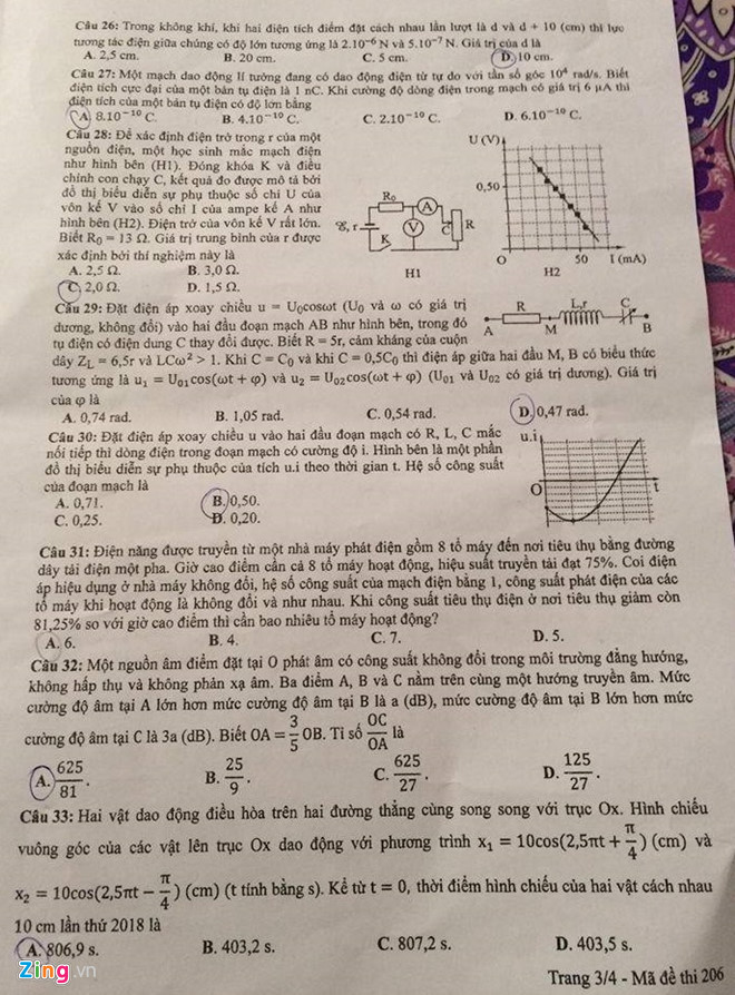 Đề thi môn Vật lý THPT quốc gia 2018 (mã đề 206):