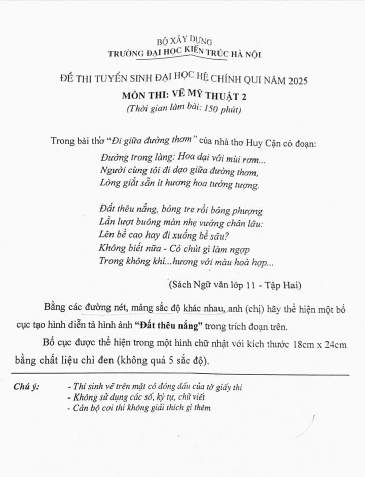 Đề thi môn Vẽ Mỹ thuật 2 tuyển sinh hệ đại học chính quy năm 2025 của trường Đại học Kiến trúc Hà Nội khiến nhiều người cảm thấy thú vị khi lướt qua ngỡ như một đề thi Văn.