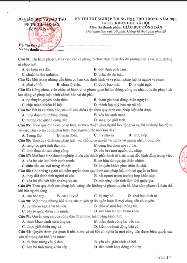 Đề thi tham khảo kỳ thi tốt nghiệp THPT Quốc gia 2020 Môn GDCD