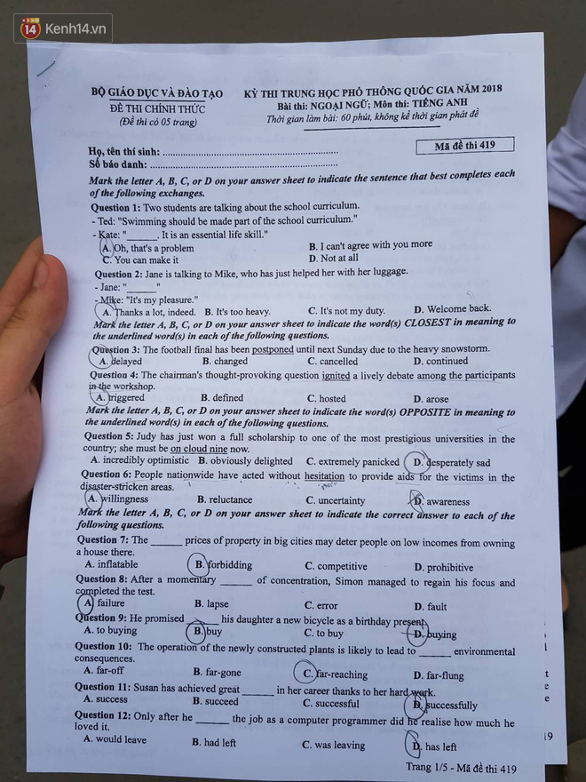 Đúng 14h30 ngày 26/6, thí sinh trên cả nước bắt đầu làm bài thi Ngoại ngữ trong kỳ thi THPT Quốc gia 2018. Đề thi gồm 50 câu trắc nghiệm trong vòng 60 phút.