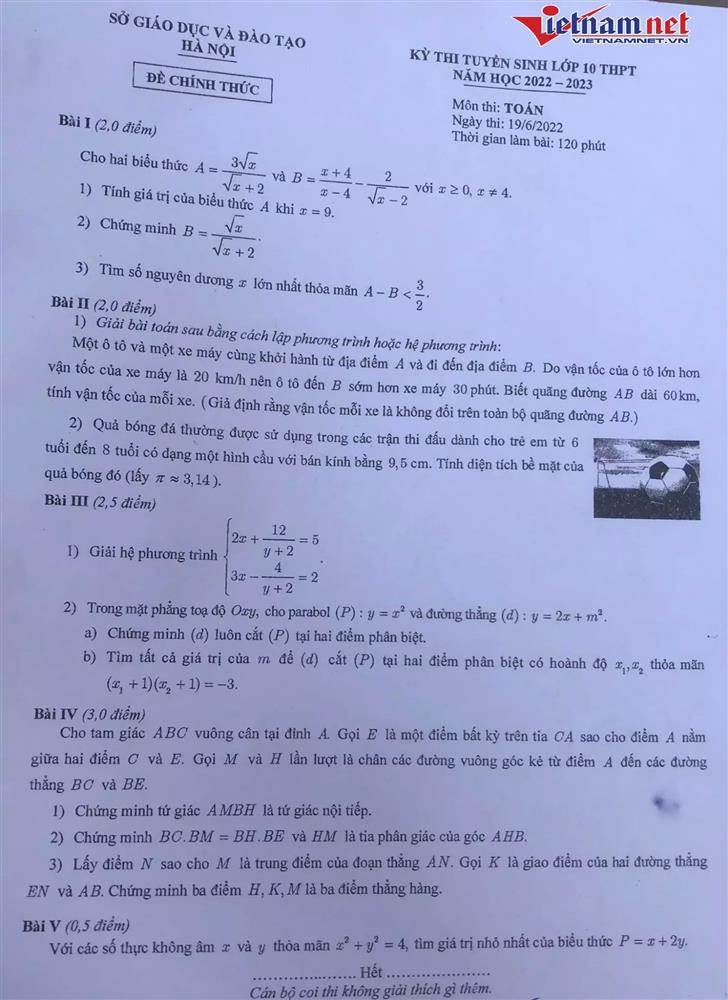 Sau đây là đề thi vào lớp 10 môn Toán tại Hà Nội năm 2022: