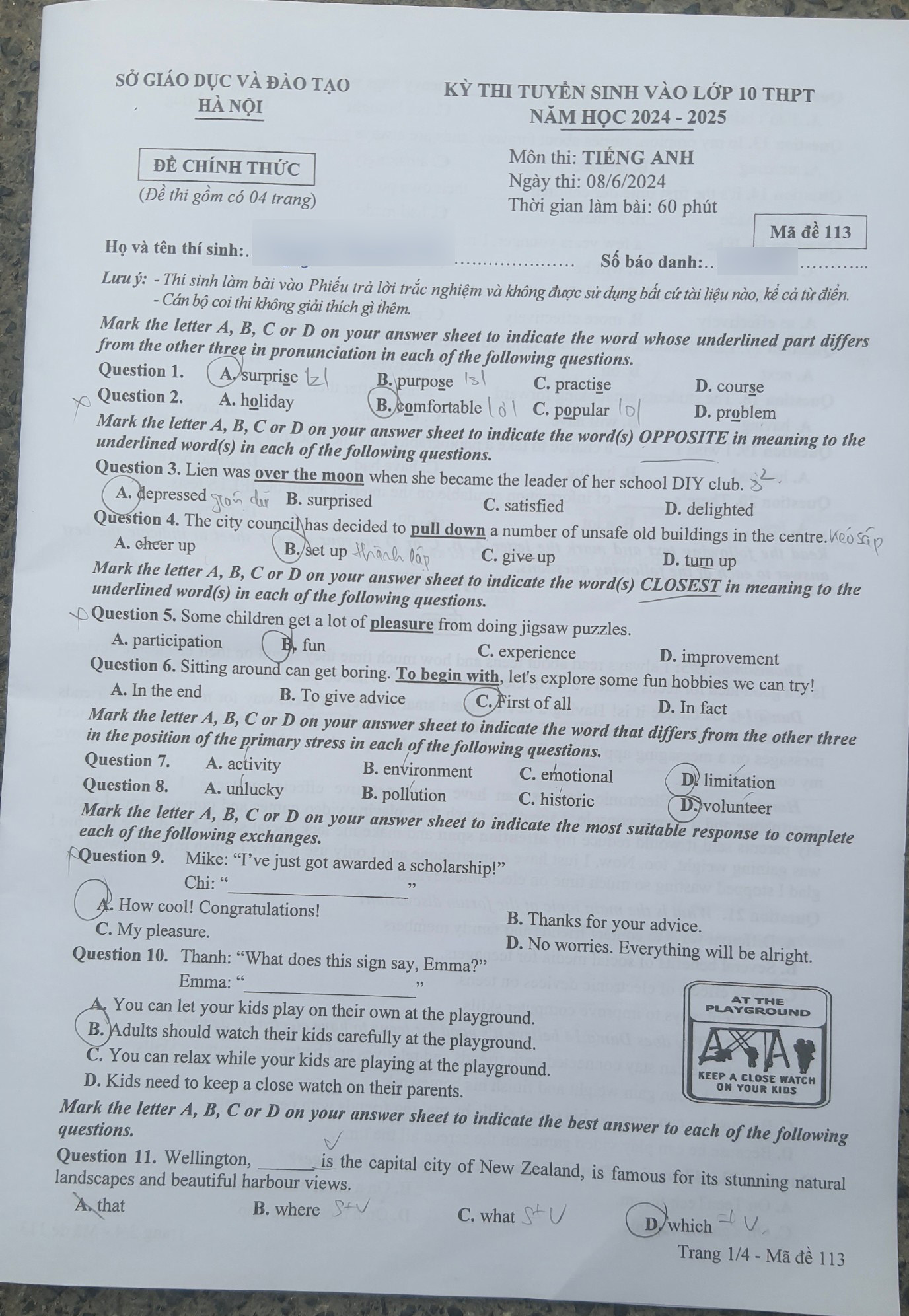 Dưới đây là đề thi vào lớp 10 môn tiếng Anh của Hà Nội năm 2024 (mã đề 113):