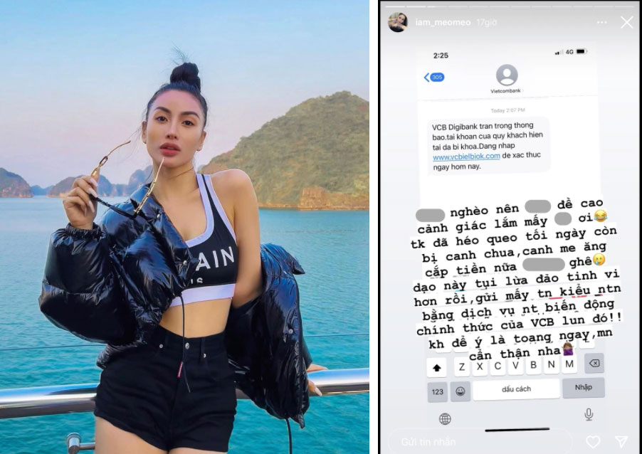 Người mới phải kêu trời khi gặp phải cảnh này là Meo Meo (tên thật là Lê Như Thuỳ) - hot girl đình đám một thời. Theo đó cô nhận được tin nhắn từ có tên ngân hàng rằng tài khoản đã bị khoá, cần phải truy cập theo 1 đường link để xác thực. Tuy nhiên Meo Meo không bị mắc bẫy mà thay vào đó đăng đàn, chia sẻ với mọi người: