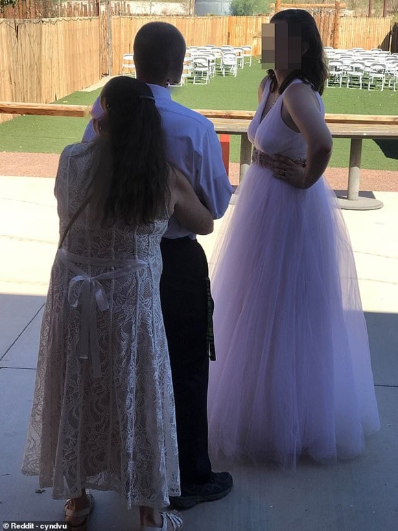 Một tài khoản tự xưng là chú của cô dâu sống ở Mỹ đã chia sẻ câu chuyện này lên diễn đàn Reddit để bênh vực và đòi lại công bằng cho cháu gái. Theo bức ảnh đính kèm, có thể thấy người đứng nhảy cùng chú rể trong lễ cưới không phải cô dâu mà lại là mẹ ruột anh. Đến dự ngày vui của con trai, người này không ngần ngại diện chiếc váy ren màu trắng hoành tráng như thể muốn "chặt chém" cô dâu. Theo lời kể thì khi nhìn thấy cảnh tượng "chướng mắt" ấy, nữ chính cũng không hề vui vẻ gì. Khoảnh khắc cả hai tựa đầu vào nhau khiến dân mạng cảm thấy cực kỳ khó chịu.