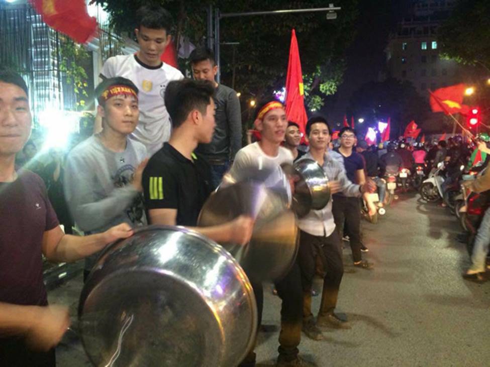 Cả một đội quân cổ vũ bằng xoong nồi vung inox nhiệt tình.