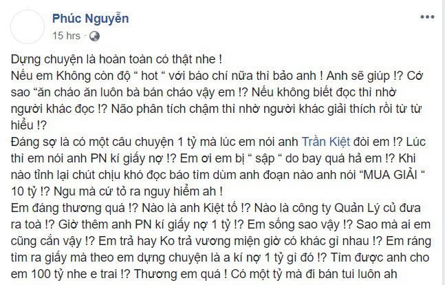 "Nếu em không còn độ "hot" với báo chí nữa thì bảo anh. Anh sẽ giúp! Cớ sao ăn cháo ăn luôn bà bán cháo vậy em?", ông Phúc Nguyễn viết.