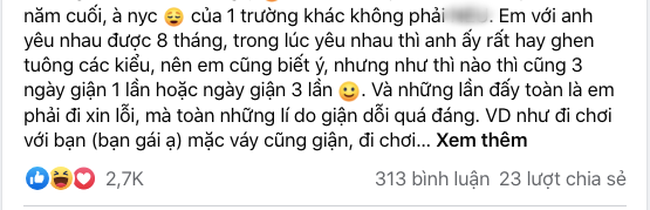 Các bạn em cứ bảo sao phải khổ thế, yêu đương mà cứ như là đeo gông ấy, bỏ đi. Nhưng em vẫn không nghe vì nghĩ anh ấy muốn tốt cho em mới như vậy.