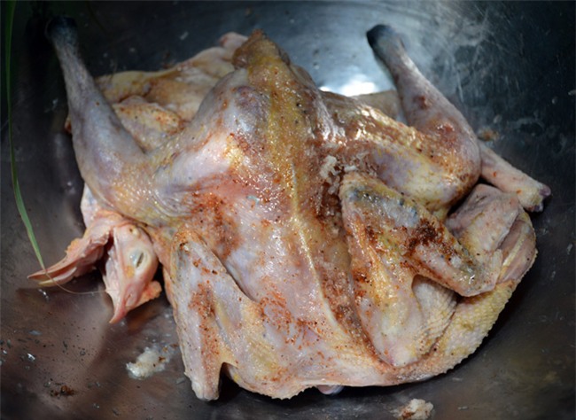 Theo những người chế biến món gà đốt tại địa phương, để làm món gà đốt phải chọn loại gà thả vườn được bắt tại chỗ, tuỳ theo thực khách chọn con bao nhiêu kg cho vừa ăn. Sau khi làm sạch gà, đầu bếp sẽ ướp các nguyên liệu như: Xả, ớt, lá chúc, tỏi... trong khoảng 20-30 phút tùy theo trọng lượng con gà. (Ảnh: Chúc Ly).