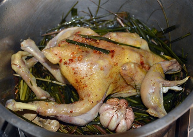 Sau đó, đổ một chút dầu, xếp một lớp xả, lá chúc dưới đáy nồi, tiếp theo là bỏ gà vào nồi đốt lên trong khoảng 15 - 20 phút. (Ảnh: Chúc Ly).