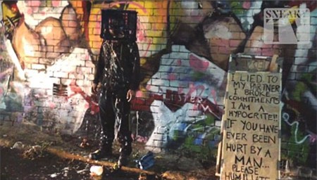 “Tôi đã lừa dối người bạn đời của tôi. Tôi đã phá vỡ lời thề nguyện. Tôi là một kẻ đạo đức giả. Nếu bạn từng bị tổn thương bởi một người đàn ông, hãy hạ nhục và ngược đãi tôi!”. Đó là những dòng chữ được ghi trên tấm biển để cạnh người đàn ông này.