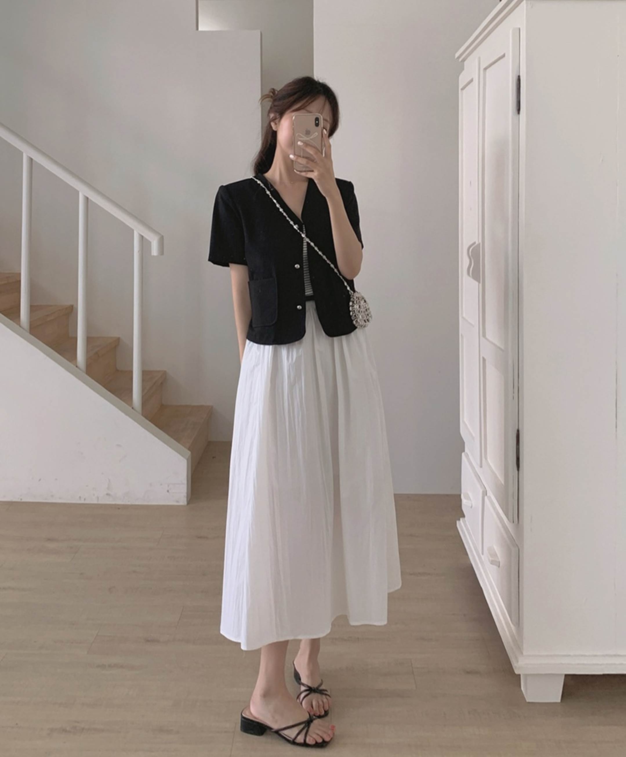 Với những item đơn giản, mang tông màu trung tính như áo khoác lửng, áo kẻ ngang, chân váy trắng, chị em sẽ có được bộ cánh trẻ trung, năng động. Thiết kế áo lửng mang tới nhiều công dụng hơn chị em tưởng, một trong số đó là tôn dáng cao ráo.
