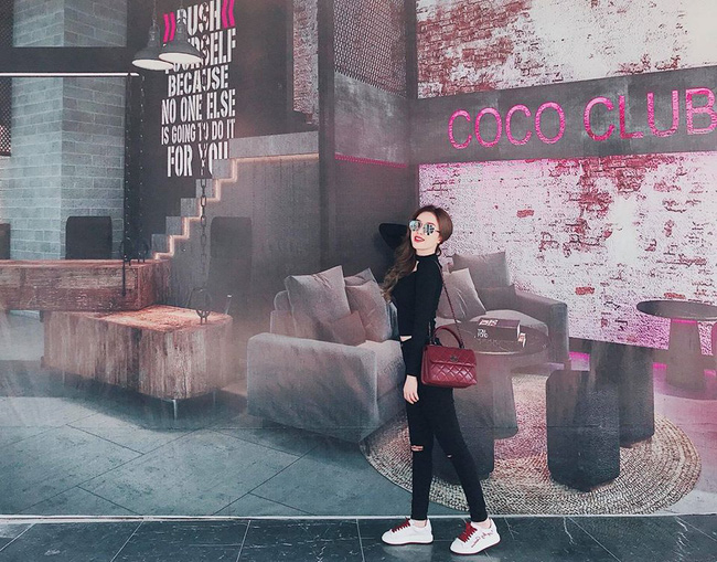 Vẫn là một cây đồ đen đơn giản mix cùng túi Chanel đỏ mận, Bảo Thy khéo phối cùng sneakers trắng.