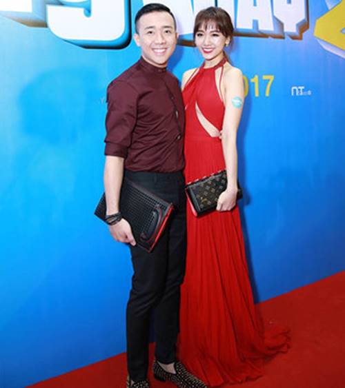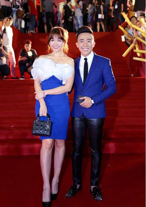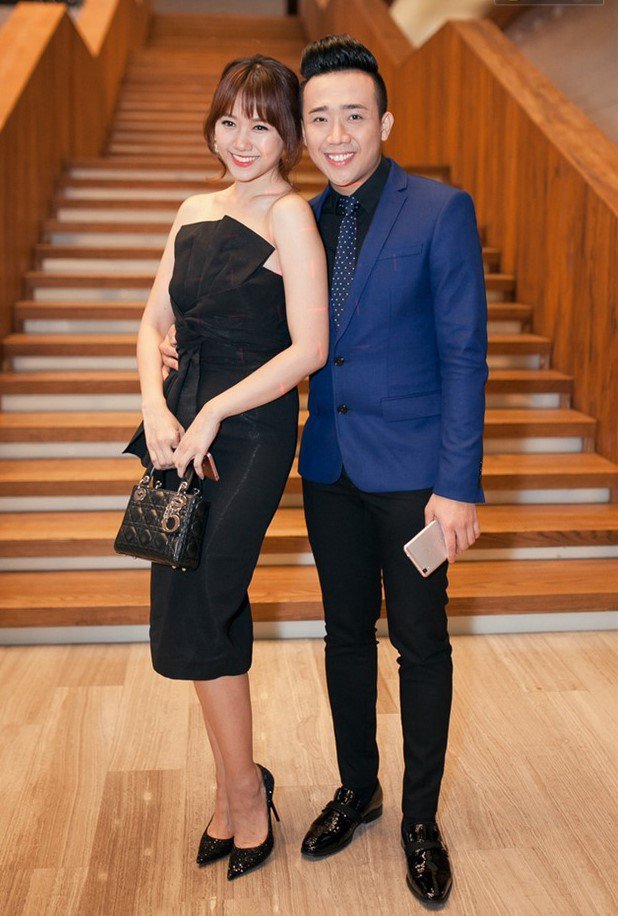 Áo khoác dài khiến tổng thể bộ trang phục thêm lùng bùng và “rút ngắn” đôi chân vốn chẳng dài của Trấn Thành. Anh chàng trở nên nhỏ bé bên người vợ xinh đẹp Hari Won.
