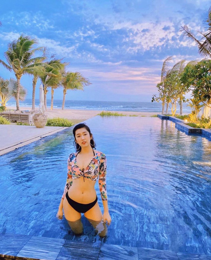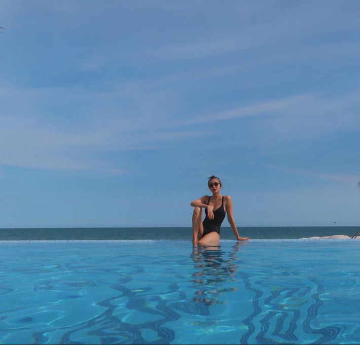 Suốt những ngày bị kẹt lại Bali do dịch, Minh Tú rất chăm diện bikini để bơi tại gia