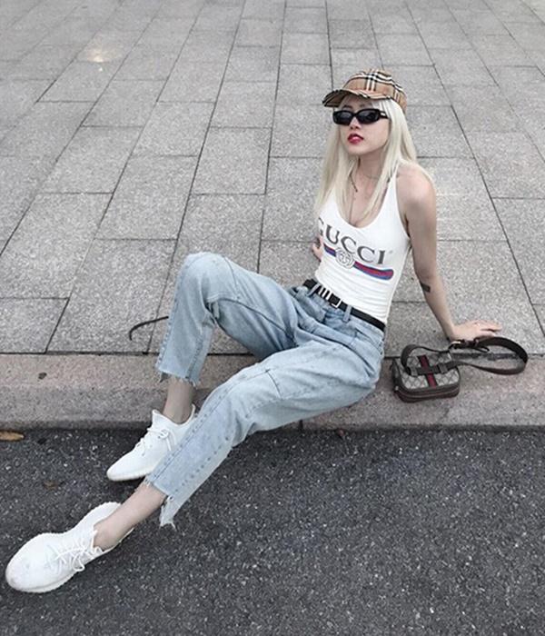 Bạn gái Sơn Tùng M-TP, nữ ca sĩ Thiều Bảo Trâm cũng "cập nhật" chiếc mũ vào trong tủ đồ hàng hiệu của mình. Cô nàng tạo ra hình ảnh cá tính khi diện mốt quần jeans cắt gấu phối cùng áo sát nách Gucci đi kèm mũ và sneaker