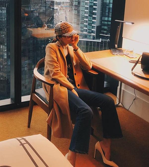 Không thua kém "chị em bạn dì", Hoa hậu Chuyển giới Quốc tế 2018 Hương Giang cũng mạnh tay chi tiền để sở hữu chiếc mũ "hot" nhất hiện nay. Cô chọn phối mũ cùng quần jeans ống loe, giày cao gót, áo thun và trench coat sang chảnh hơn bao giờ hết