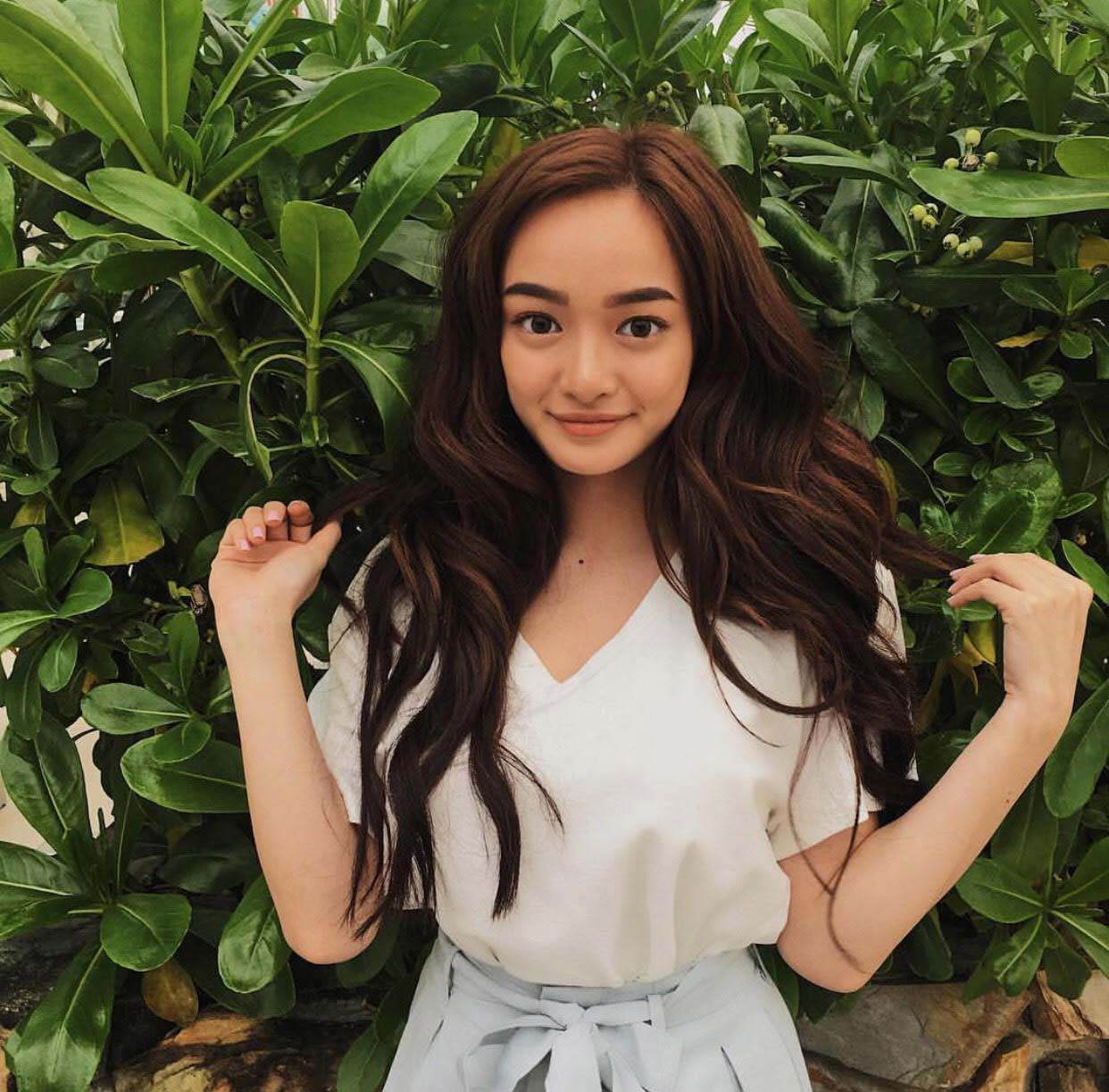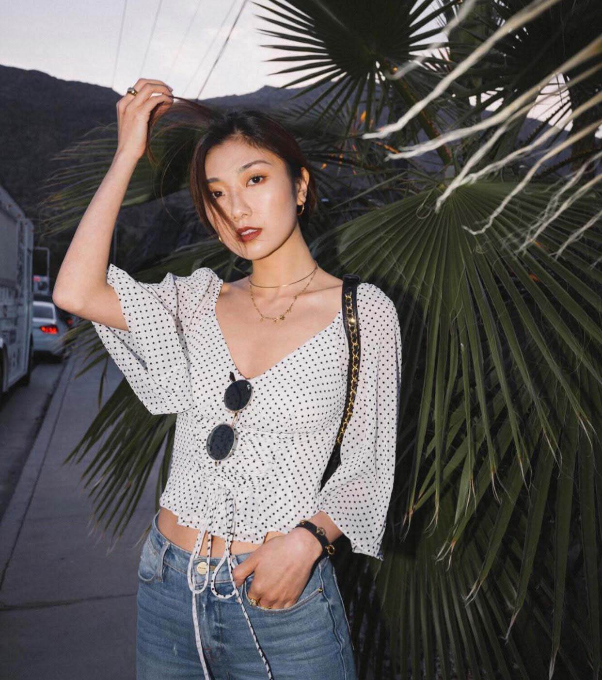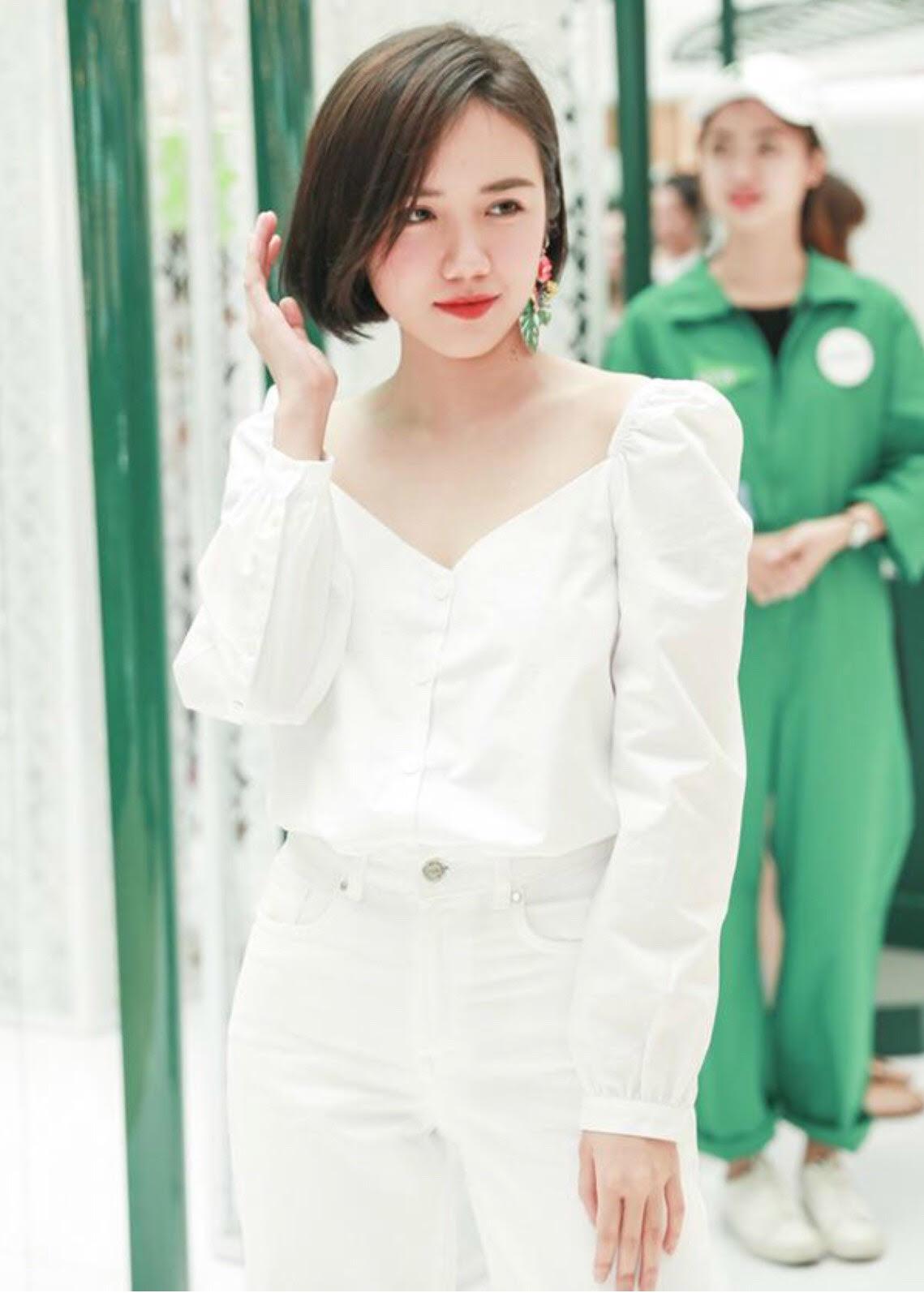 Gương mặt của Kaity Nguyễn khá tròn đầy nên rất hợp với kiểu áo cổ chữ V như thế này.
