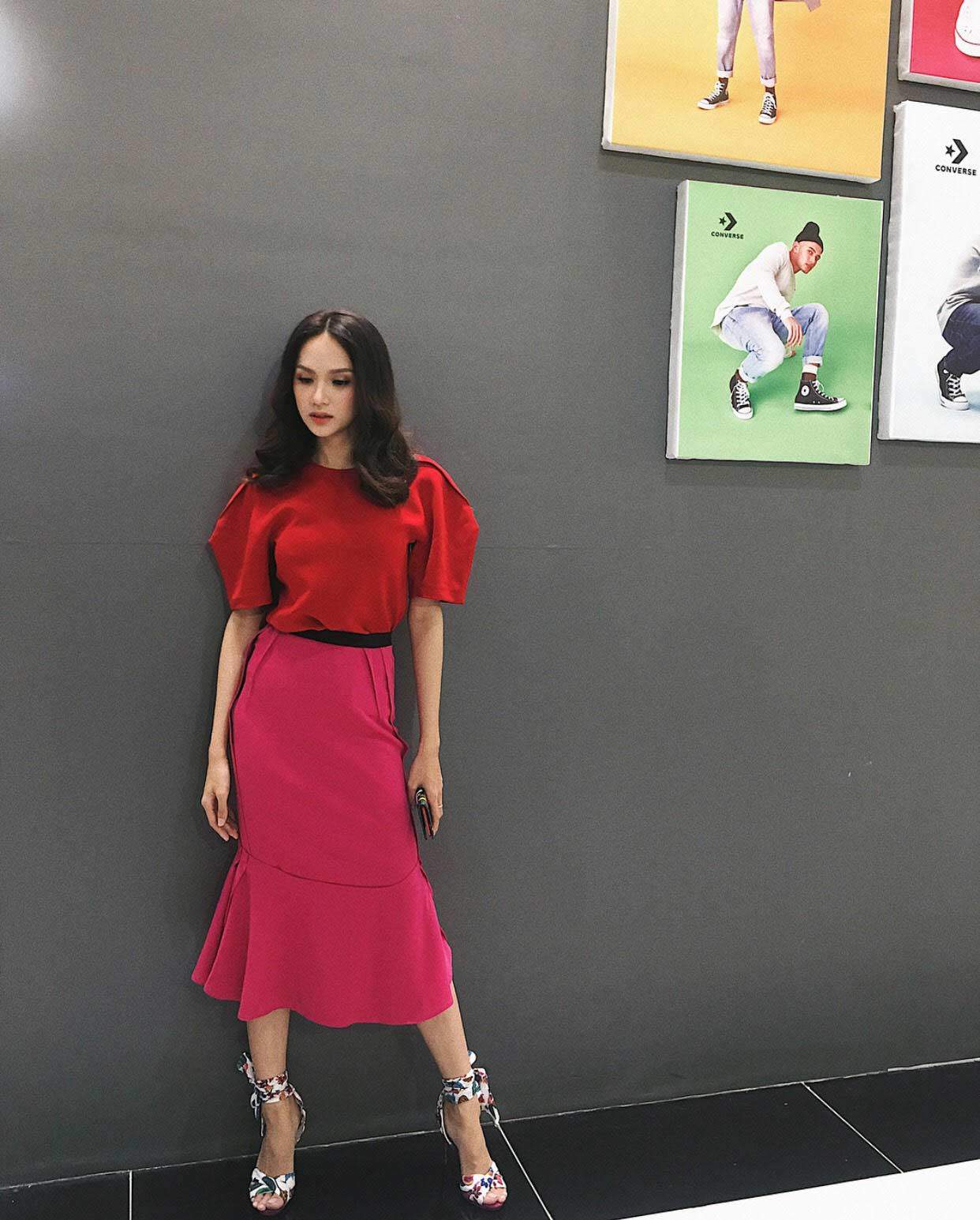Minh Hằng cũng thường xuyên xuất hiện với những items cổ tròn năng động, cá tính.