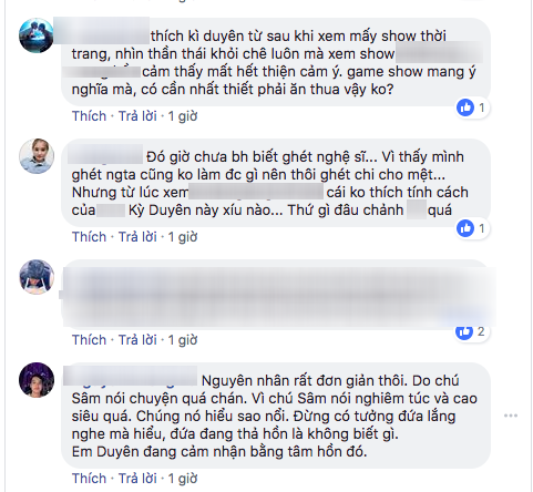 "Tại phẫu thuật thẩm mỹ bị đơ đó, em ấy muốn cười lắm mà cơ mặt không nghe lời"; "Nhìn nét mặt suốt chương trình này của Kỳ Duyên thì hình như cô ấy bị thế lực nào đó ép để tham gia thì phải? Có phải tôi nhạy cảm quá không"....là hàng loạt bình luận từ cư dân mạng.