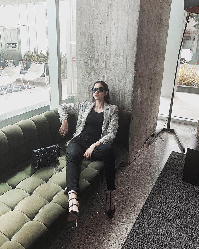 Mix áo sơmi cùng skinny jeans đơn giản nhưng cách áp dụng các phụ kiện cùng tông tinh tế đã nâng tầm cho set đồ.