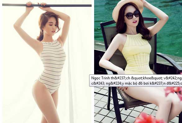 Kiểu đồ bơi được Ngọc Trinh cưng chiều nhất, hẳn nhiên là loại hai mảnh khoét ngực sâu để khoe khéo vòng 1 căng đầy. Đẹp khoe, xấu che, câu này có lẽ Ngọc Trinh hiểu rõ nhất. Từ thuở mới chập chững vào nghề tới những năm ngần đây, cô vẫn trung thành với áo tắm hai mảnh, với đủ các kiểu dáng và biến tấu khác nhau.