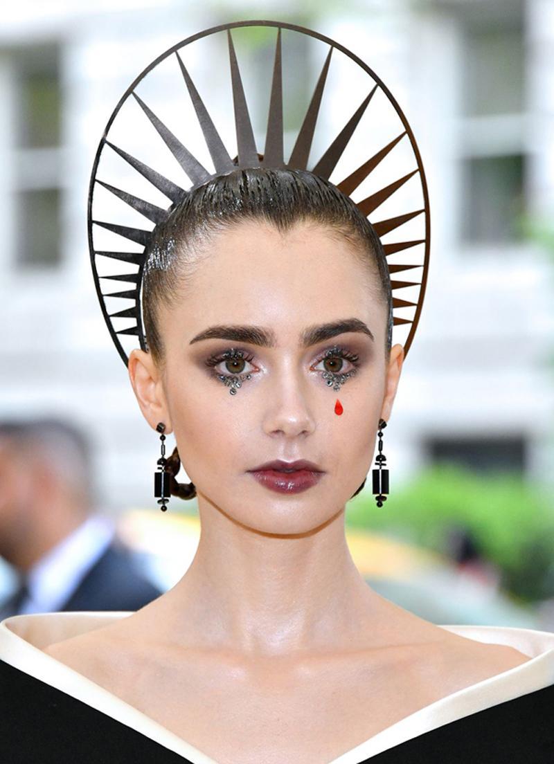 Trong khi đó, Lily Collins lại gây ấn tượng tại Met Gala với kiểu make-up độc đáo.