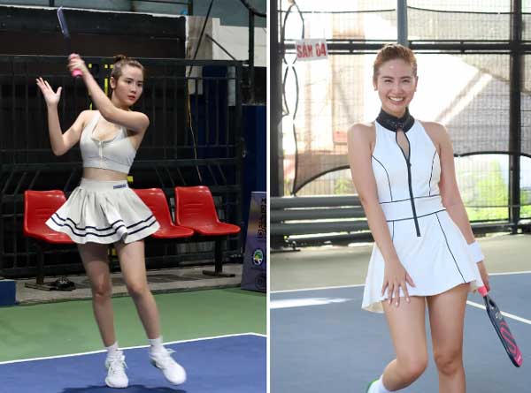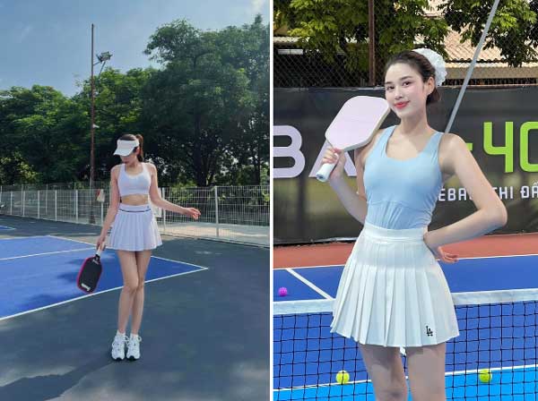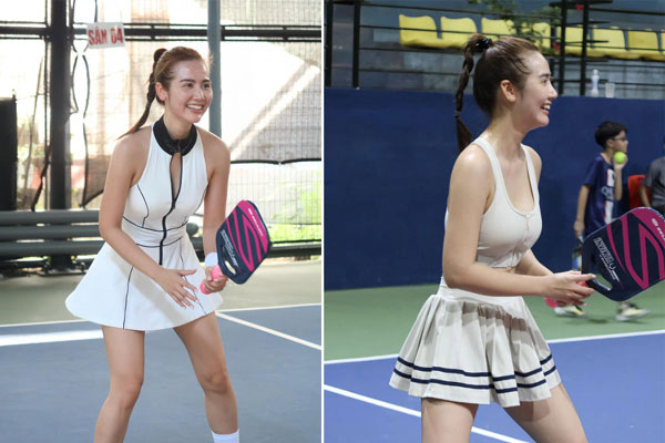 Quỳnh Nga cũng là sao nữ thích mặc trang phục tôn dáng, đặc biệt nhấn mạnh vào vòng eo bé xíu của cô. Thế nên trước đây, nữ diễn viên chuộng áo crop-top hở eo khi chơi pickleball nhưng bây giờ, cô chuyển sang áo dáng dài. Bộ váy hồng đất mà Quỳnh Nga mặc được khen xinh xắn ngọt ngào mà vẫn tiện dụng để tập thể thao.