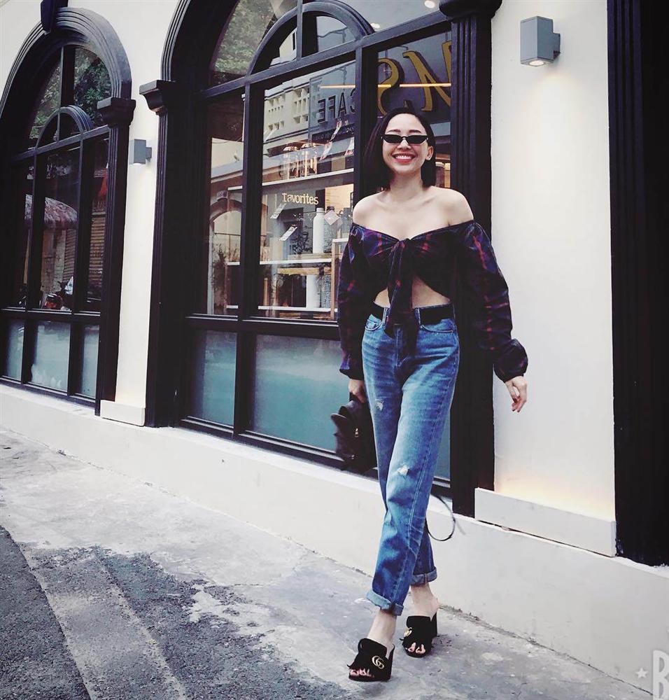Tóc Tiên khoe thời trang đường phố đầy cuốn hút với quần jeans cạp cao phối cùng chiếc áo lửng buộc vạt. Đây được đánh giá là bộ đôi đẹp hoàn hảo của mùa hè năm nay.