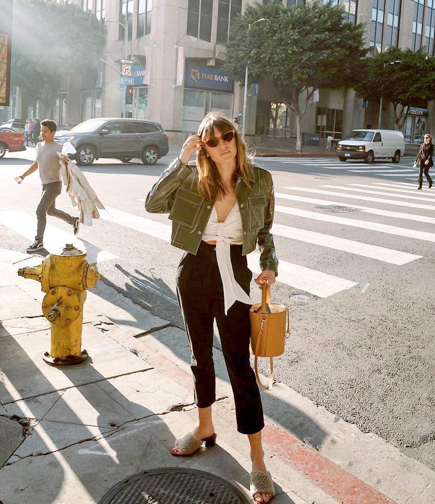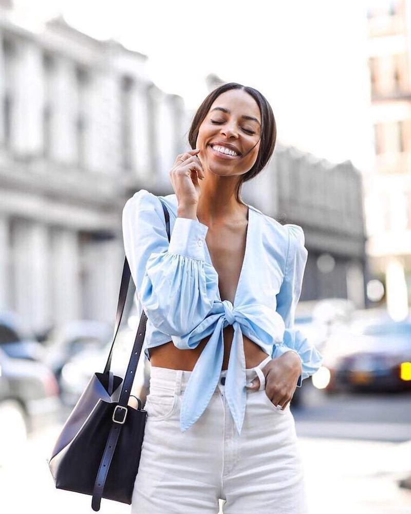 Chiếc áo lửng thắt nơ là điểm nhất thú vị cho set đồ.