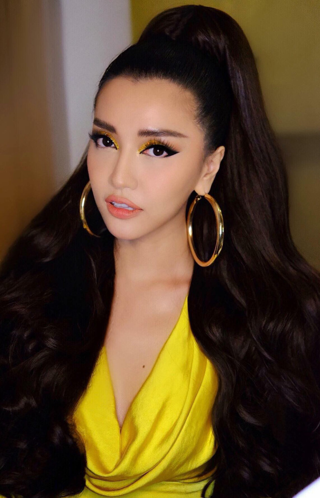 Vẫn biết nếu chọn son nude thì nên makeup mắt nhiều hơn nhưng như Bích Phương thì... nhiều quá. Hàng lông mi dày cộp, đường eyeliner quá sắc cộng thêm mái tóc giả khổng lồ như đang nuốt trọn nhan sắc của Bích Phương vậy.
