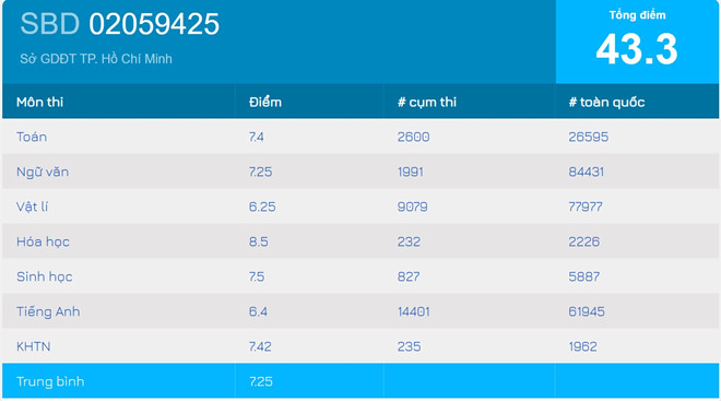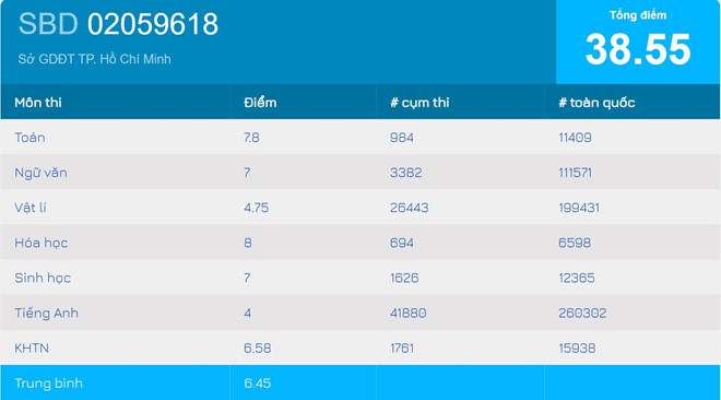 Điểm thi THPT quốc gia của thí sinh Thái Trung Kiên.